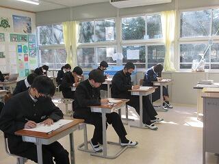 2月21日(金) 学年末テストの2日目です。昨日は技能教科、本日は5教科の総まとめのテストとなります。朝から緊張した態度でテストで臨み、最後まで真剣に答案に向かう姿がありました。3年生の県立受検はいよいよ来週です。健康に留意してこの3連休を過ごしてほしいと願ってます。