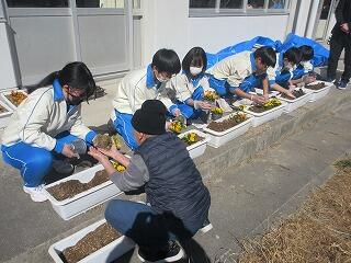 2月26日(水) ロング昼休みに、美化委員会が花苗植えを行いました。用務員さんの指導を受けながら、とてもていねいにプランターに植えていきました。完成したプランターを見て、みな大満足でした。河原子中がますますきれいになっていきます。