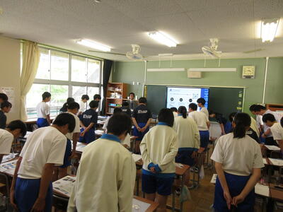 7月18日(金) 1学期終業式が行われました。各学年代表の生徒がしっかりと1学期の反省を述べ、みんなで振り返りをすることができました。夏休みの注意事項を聞く態度も大変立派でした。