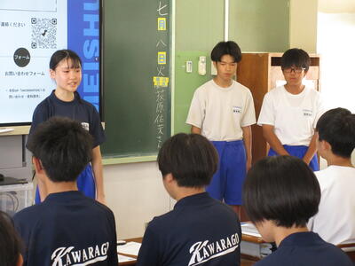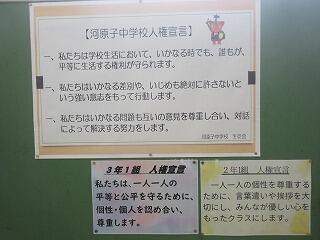 7月8日(火) SCによる「SOSの出し方教室」に1年生が参加しました。悩んでいるとき、苦しいときに誰かに話しをすること。一人だけではなく必ず3人に言うこと。それで誰かがあなたを救ってくれるとアドバイスしていただきました。河原子中では、独りで苦しまないように誰かに相談できるあたたかい雰囲気を大切にしていきます。