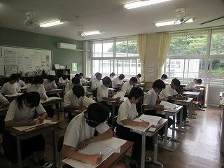 7月11日(金) 3年生が実力テストに取り組んでいます。部活動を引退した生徒が多い中、実力テストの重要性をしっかり自覚し始めています。みんな真剣な表情で答案に向かっていました。