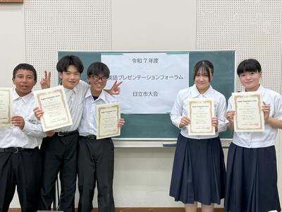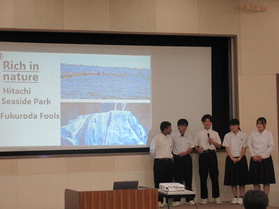 7月15日(火) 日立市教育会館で「市プレゼンテーションフォーラム」が行われました。本校から代表の生徒5名が参加しました。他校の生徒の発表を聞いて英語で質問をする場面と、プレゼンターとして英語で発表をする場面の2つの構成で争われます。緊張していましたが、堂々と大きな声で発表することができました。とても立派でした。ここまで練習を頑張ってきたことをたたえたいと思います。