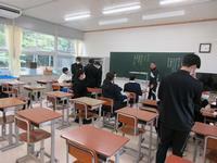 第1回避難訓練が行われました。地震が発生し、その後家庭科室から出火したとの想定。災害はいついかなる時に起こるか予測はできません。常に災害から身を守るための知識を身に付け、正しい判断力と実践力を養っておかねばなりません。1年生にとっては中学校での初めての、2・3年生にとっても新教室での初めての訓練となりました。